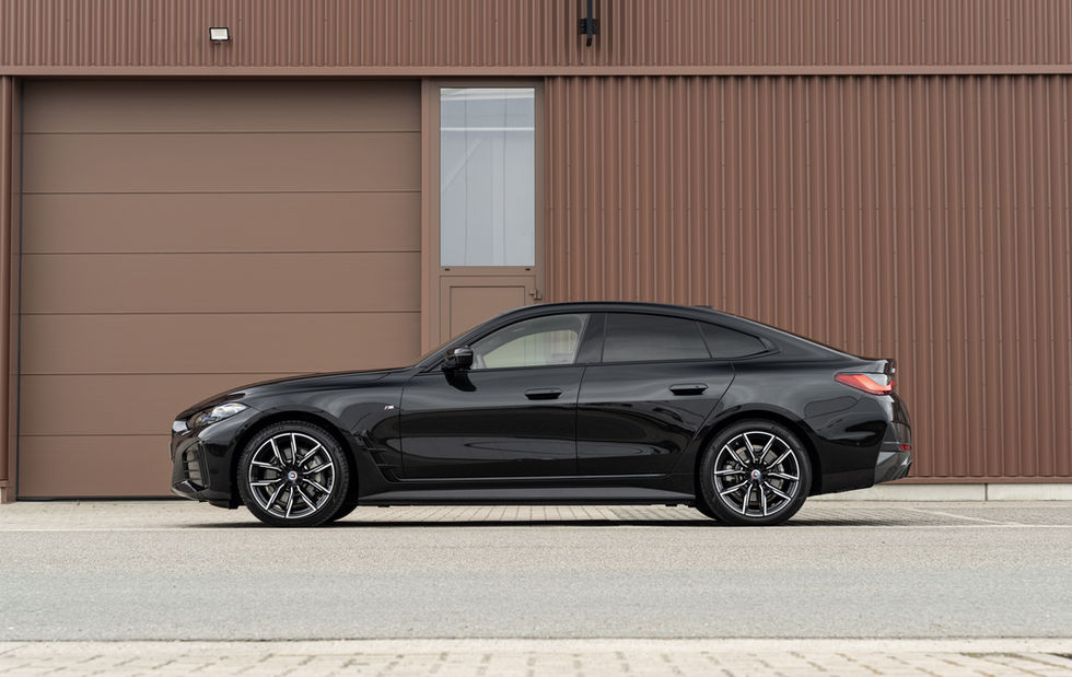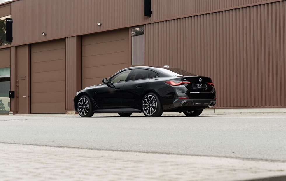 BMW i4 edrive35 uitgevoerd in Black Sapphire Metallic, een tijdloze kleur die de lijnen van de i4 mooi tot zijn recht laat komen.